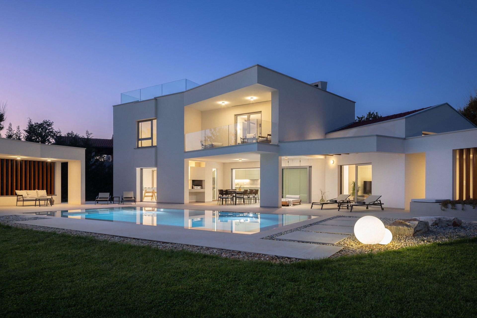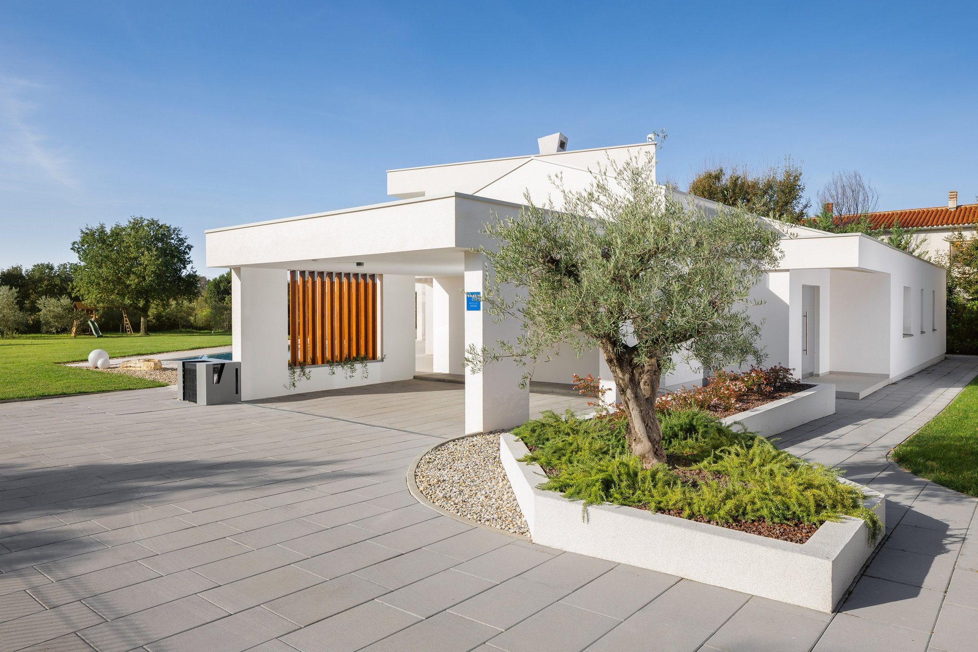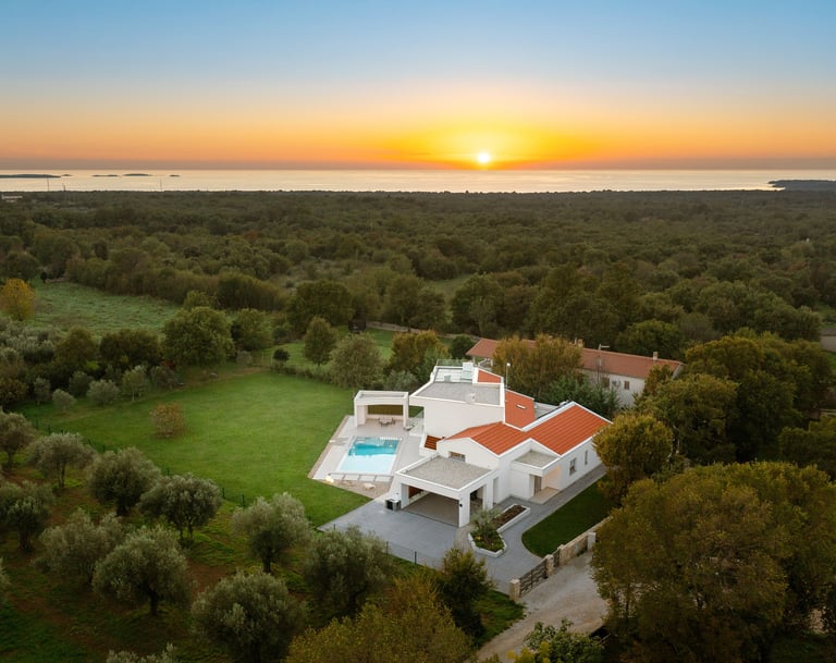 Villa Brioli bietet eine Wohn- und Erholungsfläche von 350 m2 auf einem umzäunten Gartengrundstück von 2600 m2. Swimmingpool mit Whirlpool 42 m2. Ladegerät für Elektroautos und 4 Fahrräder kostenlos. Der Mittelpunkt ist der in die Außenterrasse integrierte, beheizte Swimmingpool mit umweltfreundlicher Wasseraufbereitung und integrierter Wasser- und Luftmassage. Die große überdachte Terrasse ist eine Erweiterung des Esszimmers und der Küche. Diese Terrasse dient als barrierefreie Verbindung zwischen Innen- und Außenbereich und bringt Sie in völlige Balance. Im Erdgeschoss befinden sich drei Doppelzimmer mit jeweils eigenem Bad, die Privatsphäre und absolute Entspannung gewährleisten. Nach einem angenehmen, sonnigen Tag am Pool können Sie den Abend in einem modernen, typischen Weinkeller ausklingen lassen und die hervorragenden istrischen Weine genießen. Eine erholsame Nacht können Sie in einem komfortabel eingerichteten Hauptschlafzimmer im ersten Stock verbringen. Sie schlafen in einem großen Kingsize-Bett (200x200cm). Das Hauptschlafzimmer verfügt über ein luxuriöses Badezimmer (2 Waschbecken, Dusche, Badewanne, Bidet) und einen überdachten Balkon mit Blick auf den Pool und den großen Garten mit Olivenbäumen. Bei Bedarf stehen im ersten Stock weitere Schlafplätze in einer Galerie mit separatem Badezimmer und einer Treppe zur Dachterrasse zur Verfügung. Von der Dachterrasse aus können Sie die Sonnenuntergänge über der Adria genießen. Für unsere kleinen Gäste bieten wir ein verspieltes Haus mit vielen Ecken und Winkeln, die immer wieder erkundet werden können. Die großen Gemeinschaftsräume im Wohnzimmer und auf den zahlreichen Terrassen laden alle Bewohner zum gemeinsamen Spielen und anderen Aktivitäten ein. Wir bieten Tischfußball, Tischtennis, Badminton, Schaukeln und gemeinsame Fahrradtouren an. Wir vermieten bevorzugt an Familien und Gäste, die die luxuriöse Ausstattung und die ruhige Lage unserer Villa schätzen.